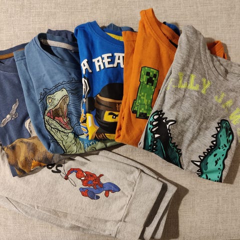 Yhteensä 6 kpl huppareita ja verkkatakkeja, 5 kpl t-paitaa, 1 kpl pitkähihaisia ja yksi sadetakki. Kaikkien koko 122/128.