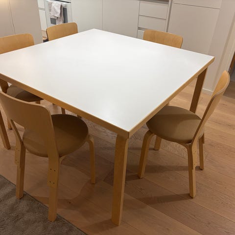 Alvar Aalto ruokapöytä valkoisella laminaattipinnalla, malli 82A. Erittäin siisti, pinnassa ei jälkiä/naarmuja, tummentumia. Savuton ja ei kotieläimiä taloudessa. Jalat erittäin siistit ja kolhuttomat. Lisäkuvia tarvittaessa.