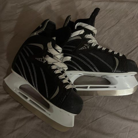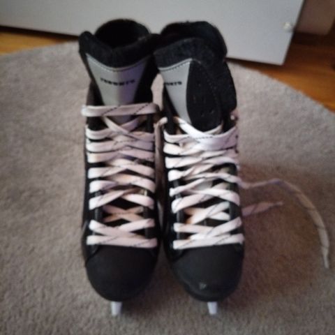 Tarpeettomaksi jääneet hokkarit kokoa 36. NHL5000 merkkiset luistimet ja luistinsuojat muistaakseni löytyvät myös mukaan. Toisen luistimen kärjessä pieni osuma joka kuvien ottamisen jälkeen paikattu. Kokonaisuutena siistikuntoiset.