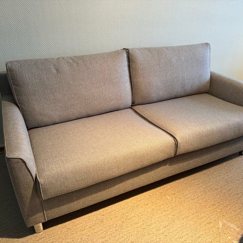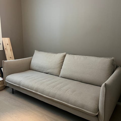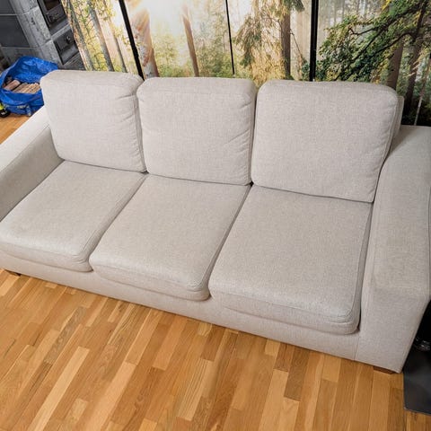 Harmaa kolmen istuttava ryhdikäs sohva olohuoneeseen tai vierashuoneeseen. Ei tahroja ei kulumia. Sohva on hyvässä kunnossa. Istumasyvyys n. 54cm. Istumakorkeus n. 45cm.