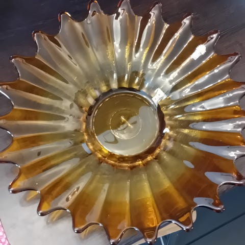 Tauno Virkkalan 1972-1987 Humppilan lasin uotannossa ollut ruskea lasinen kulho, jossa koristeellinen aaltoileva reuna. Kulho soveltuu esimerkiksi tarjoiluun tai koristekäyttöön. Nouto