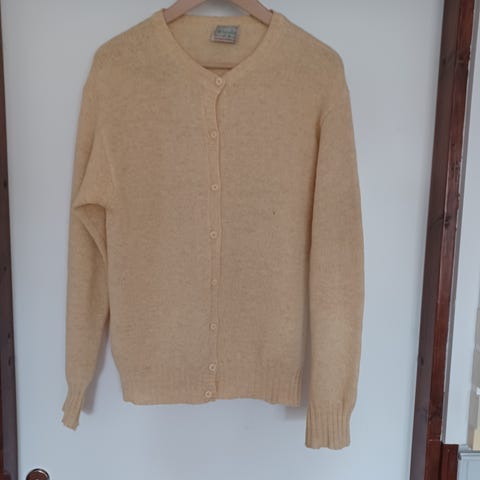 Isokokoinen käsinkudottu villatakki. Väri lämpimän keltainen.
