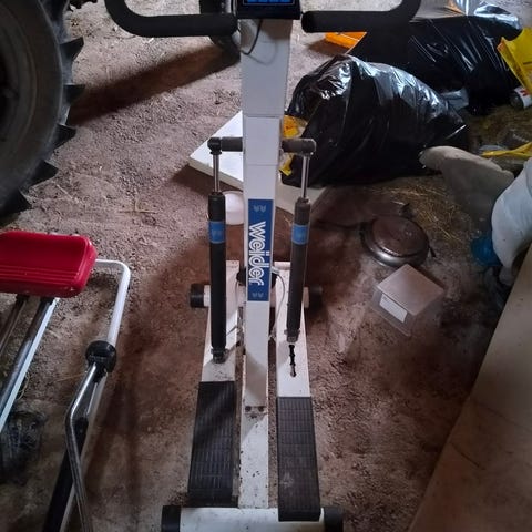 Ovikuntolaite, 3 kahvakuulaa (2*5 kg ja 10 kg) voimapyörä, vastuskuminauhat (ei enää alkuperäistä vastusta) käsipainot 2 kpl 1 kg ja 2 kg. Rannevahvistimet yms.