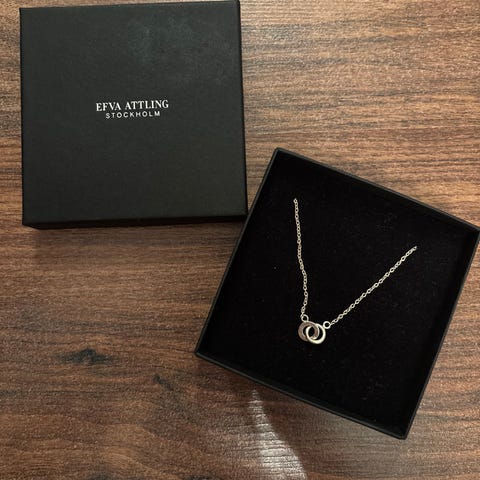 Upea Hopeinen Kaksi yhdessä=TWOSOME koru,muistuttaa hyvin pitkälti minusta Efva Attlingin korusta mutten tiedä onko ?,Riipuksen halkaisija on 2,3 cm,jokatapauksessa todella näyttävä ja kaunis rasiakin tulee mukana,koko paketti vain 79€
