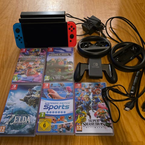 Nintendo Switch pelikonsoli paketti joka sisältää konsolin, Joy-Con-ohjaimet, telakan ja tarvittavat kaapelit. Konsolissa sisässä mukana nintendo Swich Sports peli johon Oniverse Sports Kit 12-in-1, jossa urheiluvälineitä sportti pelien ohjaamiseen. Lisäksi paketti sisältää kolme peliä: Mario Kart 8 Deluxe, F.C. 2023 ja minecraft legends