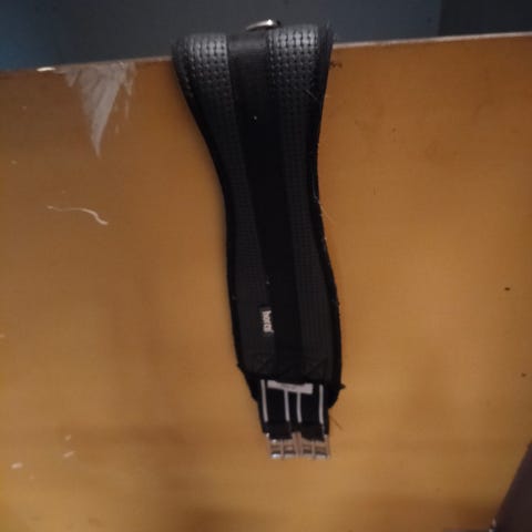 Satulavyö, jossa toisella puolella jousto. Pituus 130 cm. Reunakangas rispaantunut toisella puolella, näkyy kuvassa. Vaatii putsausta.