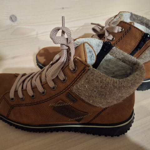 Lämpimät villavuoriset ja kevyet Rieker talvikengät koko 39, vettähylkivä kalvo päällisen alla, toimivat vetoketjut sisäreunoissa, virhe oikeassa kengässä koristevetoketjun vieressä