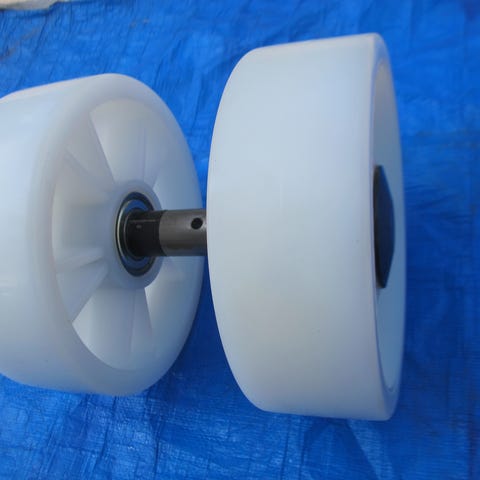 2 kappaletta nailonpyöriä laakereilla, joita käytetään pumppukärryjen isoina pyörinä.