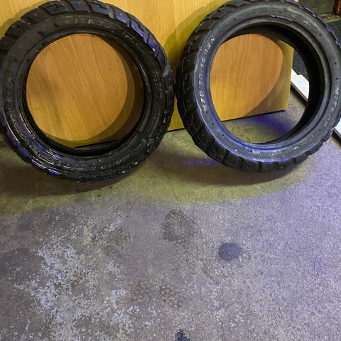 Skootterin nastarenkaat vanteilla. Rengaskoko: 120-70 12" (etu) ja 130-70 12" (taka). Eturenkaassa liki 200 nastaa ja takarenkaassa 180 nastaa (23 puuttuu), eli pitoa löytyy.