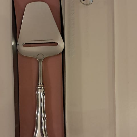 Käyttämätön juustoveitsi, kahva hopeaa ja terä ruostumatonta terästä. Ei kaiverruksia.