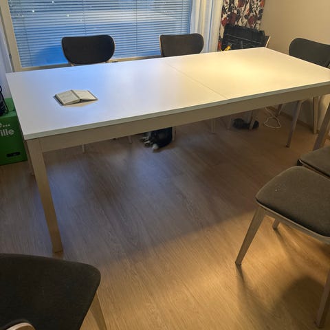 Ruokapöytä, jossa pöytälevynä Noble Supreme White kvartsitaso. Alla musta metallirunko. Pöytälevyn koko 190x90x2cm. Nouto Espoon Olarista.