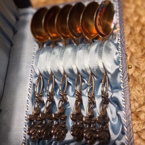 830 hopeaa, ruusulusikat 815 (tai 813) ja sen alapuolella oleva 7 lusikan sarja 915 hopeaa.