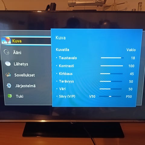 Ennen myyntiin laittamista todettu toimivaksi; ruudussa ei säröjä, menee päälle, ohjaus toimii. Muutossa valitettavasti kaukosäädin hävinnyt mutta netistä saa samsungin yleistoimivia kauko-ohjaimia helposti. Sekä seinäpidike että jalka löytyvät. Niiden ruuvit valitettavasti tippuneet matkalla johonkin, hyvin helppo hoitaa itse myös.
