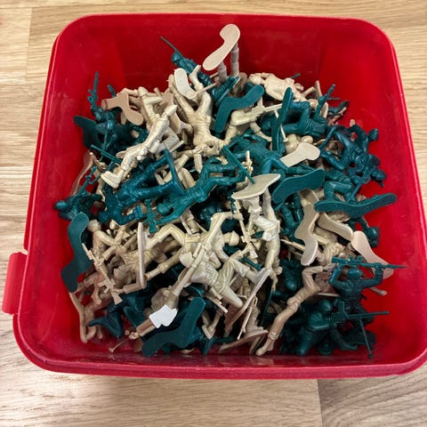 Vanhoja muovisia sotilaita 57 kpl ja paljon erilaista sotakalustoa luultavasti 80- ja 90-luvuilta.