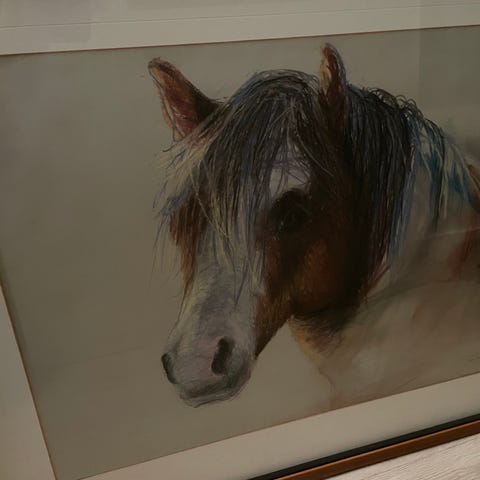 Pia Feinikin hevosaiheinen teos vuodelta 2012. Kehystetty valkoisiin kehyksiin.