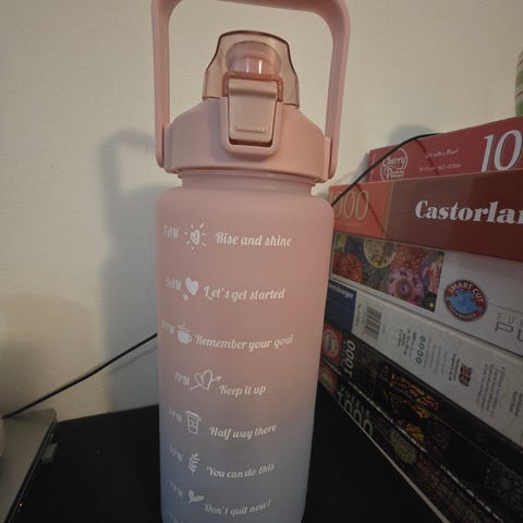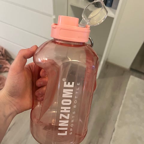 Rusta iso juomapullo, väriltään vaaleanpunainen.