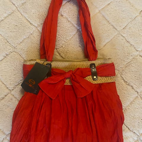 Punainen laukku Koko 18x12x4 cm seepra hihna pituudeltaan 115 cm. Sivussa tasku, niinkuin myös sisällä pieni vetoketjullinen sivutasku. Eläimetön ja savuton talous.