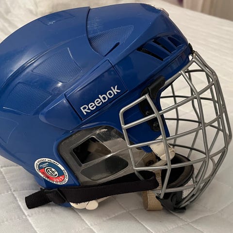 Myydään Reebokin sininen jääkiekkokypärä ristikolla,