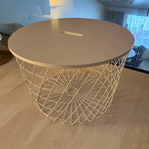 Itse päällystetty valkoinen Ikea kvistbro. Laidoista näkyy kulumaa. Teippaukset saa irti.
