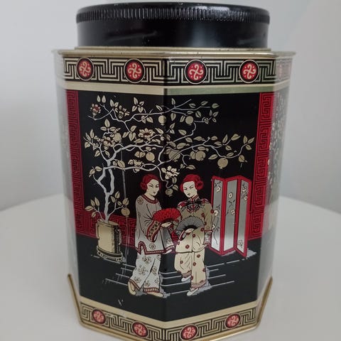 Kuvienmukainen herkullinen 1960 luvun suhteellisen siisti vanha metallinen karamellipurkki.