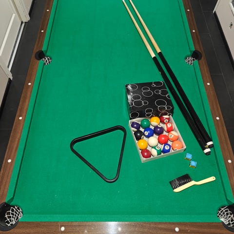 Biljardipöytä on ehjä ja siistissä kunnossa. Hieman käytön jälkiä.