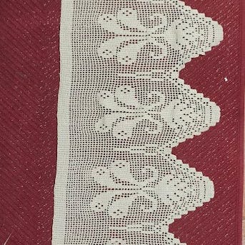 Virkattu verhokappa, väri vihreä, 2 kappaletta. Verhokapassa on koristeellinen kuviointi ja sahalaitainen reuna. Sopii ikkunakoristeeksi. Huolella virkattu. Hinta molemmista yhteensä 15 euroa. Voin lähettää. Mmm.
