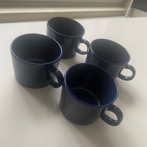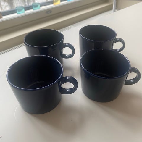 Myydään 4 kpl sinisiä teemamukeja. Ei suurempia käytönjälkiä.