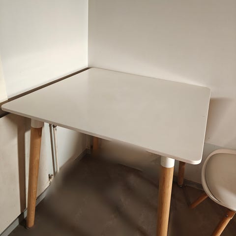 Vanhasta ovesta jonkun duunaama pöytä lasilevyllä.