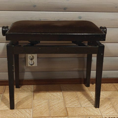 Pianojakkara, jossa ruskea pehmustettu istuin ja puurunko. Sopii pianon ääreen istumiseen.