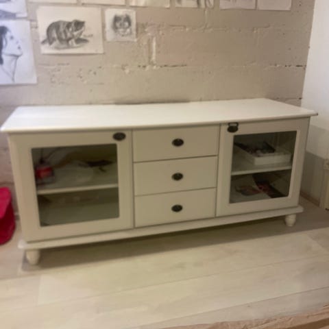 Suomalainen puinen TV-taso, jossa on valkoinen viimeistely. Kalusteessa on useita säilytystiloja, mukaan lukien vetolaatikot ja lasiovellinen osio. Sopii olohuoneen tai viihdetilan kalusteeksi. Kunto hyvä ei naarmuja tms. Robotti-imuri mahtuu alle imuroimaan vain nouto.