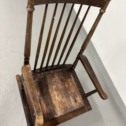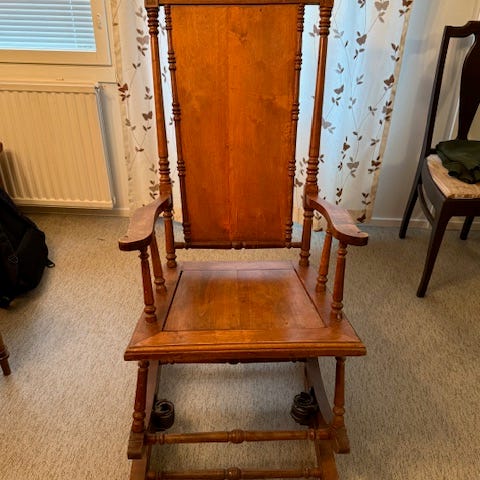 Puinen keinutuoli, jossa on käsinojat ja raidallinen istuinpehmuste. Tuolissa on koristeellinen selkänoja ja kaarevat keinuvat jalat. Erittäin siisti ja hyvinpidetty