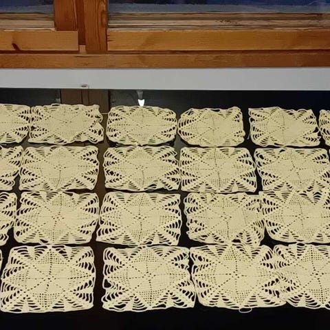 Käsinvirkattuja tekstiilejä paksummasta puuvillalangasta