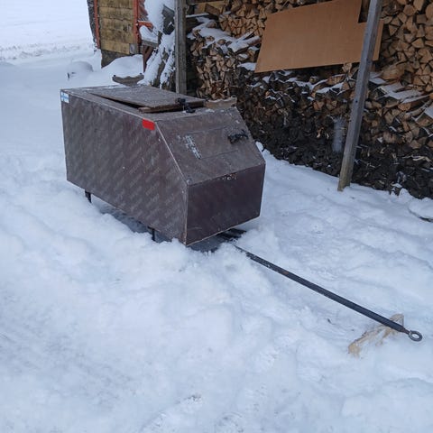 Käytönjälkiä on, mutta hyväkuntoinen ja kevyt, toimiva ahkio.
