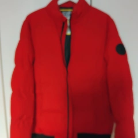 Kaunis punainen talvitakki, jossa vetoketjulla irrotettava huppu sekä hupun karvareunus on napeilla irrotettavissa. Takissa kokomerkinttä 38, mutta vastaa kokoa 36. Materiaali 100% polyesteria