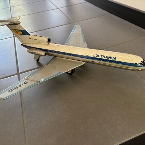Joustran tekemä Air Francen jumbo. Muovia ja peltiä. Kehokuntoinen alkuperäinen laatikko mukaan. Ei kokeiltu pattereilla käyntiin.