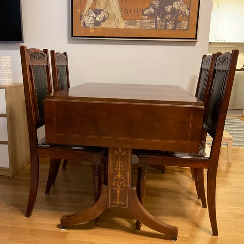 Iso täysin virheetön Carmen-intarsiapöytä Unkarista, antiikkia, upea!