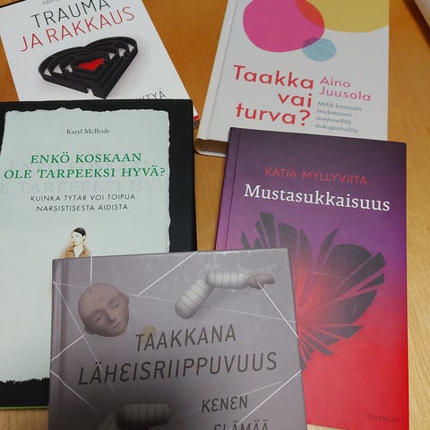 Uusia parisuhdetta käsitteleviä kirjoja. Maineikkaiden kirjoittajien esim, Maaret Kallion: Tunne hyvä syhde, myös parisuhteen haastavammalta puolelta esim. Veitsen terällä.