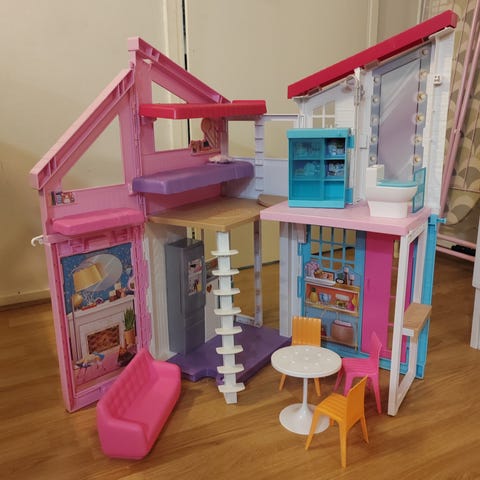 Kasaan taitettava kaksikerroksinen barbitalo. Kuvissa kasassa, avattuna ja osa irto-osista paikalleen laitettuna, kasaan laitettaessa portaat ja kaiteet otettava irti. Sänky, kylpyamme ja muut voi "lukita" säilytystä varten ylös seinälle. Toinen katon yläosan torniosa on murtunut , mutta pysyy paikallaan - kuvissa irti ja paikallaan.