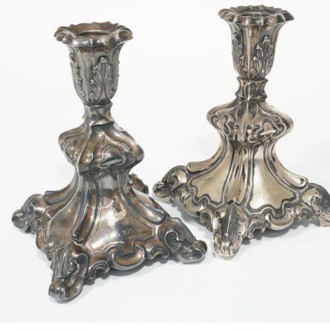 2 kpl Barokki hopeinen kynttilänjalka. 18cm korkea noin 570 ja 585g, H813. Käytön jälkiä.
