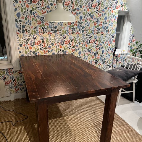 Jykevä vanha pöytä. Puusepäntyötä, eli ei kulmarautaliitoksia tai vastaavia. Lisäksi 8 talonpoikaistuolia.