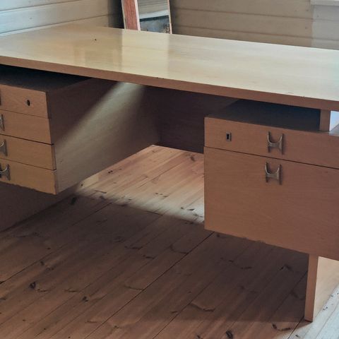 Vanha puinen kirjoituspöytä, jossa näkyy käytön jälkiä ja kulumaa. Pöytä on suunniteltu istumakäyttöön ja siinä on tasainen työskentelypinta.