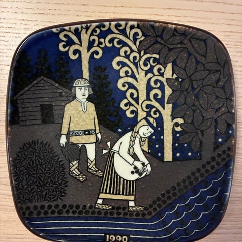 Arabia Kalevala vuosilautanen, valmistettu keramiikasta vuonna 1989. Suunnittelija Raija Uosikkinen. Sopii seinäkoristeeksi.