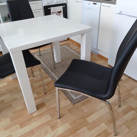 Valkoinen pöytä ja (4x) tuoli setti. Käytön jälkiä löytyy hieman.