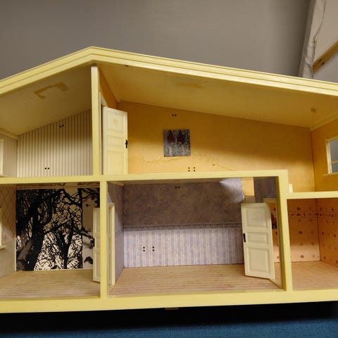 Nukkekoti, kohtalaisessa kunnossa ja monessa paikkaa tapetti tai lattia kulunut.
