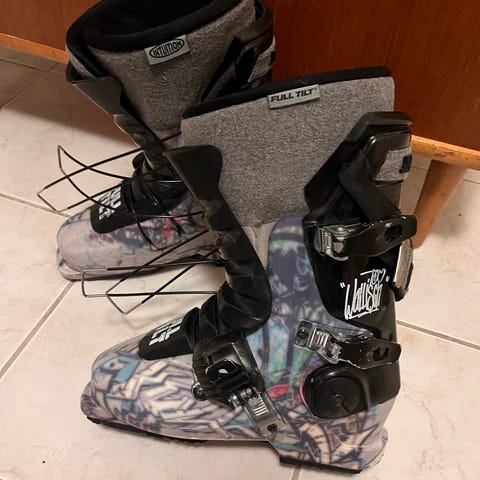 Laadukaat Full Tilt merkkiset parkkimonot / ns. temppumonot. Monot suunniteltu erityisesti parkkisuksien / twintip-suksien kanssa käytettäviksi (hypyt, temput yms.), mm. flexin kovuus sopiva sekä pohjat suunniteltu siten että vaimentavat tehokkaasti jalkoihin kohdistuvaa iskua hypyn jälkeen. Monoissa 3-osainen rakenne: koostuu kuoresta, läpästä ja varresta joka tekee pukemisesta helppoa ja tuottaa luonnollisen, tasaisen jouston. Monojen sisämitta 26.50 cm eli vastaa n.40-41 kokoa karkeasti arvioituna. Kaikinpuolin hyväkuntoiset siistit monot, kaikki soljet ja lenkit yms. kunnossa. Hienot monot. Hinta 130 e