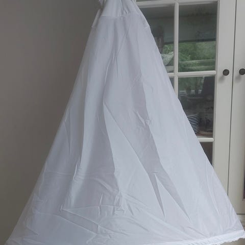 Vannehame, jossa helmavanne. Päällä tylli. Kokonaispituus 100 cm ja vanteen halkaisija 83 cm. Vyötärö on nauhalla säädettävä eli sikäli kooltaa muuntuja.