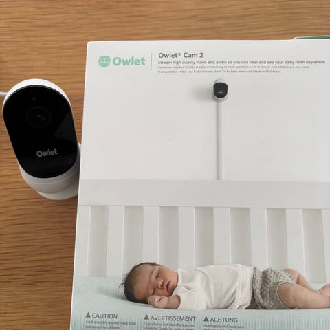 Owlet V2 kameravalvontalaite, väri valkoinen. Laite on suunniteltu sisäkäyttöön ja sisältää kameran valvontaa varten. Sopii esimerkiksi lastenhuoneen tai kodin turvallisuuden tarkkailuun.