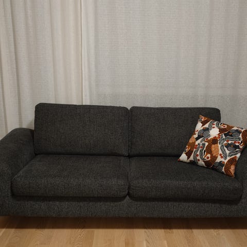 Myynnissä Asko omalla sohvatehtaalla Suomessa (Lahdessa) valmistettu reilun kokoinen 2:n istuttava Salla sohva. Kauniisti kaartuvat käsinojat ja metallijalat tekevät sohvasta samaan aikaan hyvin näyttävän, että kutsuvan. Sohvan runko ja jouset ovat ehjät. Istuin ja selkätyynyjen kankaat ovat irroitettavissa pesuun. Kankaat tahrattomat. Korkeat jalat mahdollistavat helpon puhtaanapidon sohvan alta. Sohvan kunnossa ei negatiivista huomautettavaa. Mukaan saa halutessaan kahdessa viimeisessä kuvassa olevan niskatyynyn. Tämä sohva on kotimaisuutta siistiä etsivän valinta. Sohvan hinta: 349e.