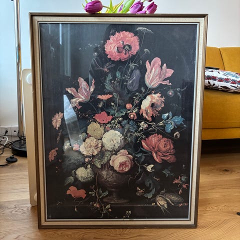 Hyväkuntoinen kukkataulu lasikehyksessä paspatuurilla.