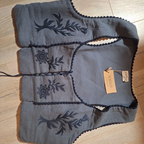 Erittäin hyväkuntoinen laadukas saksalainen MUREK Modell silkkitoppi. Materiaali silkki, myös vuori silkkiä. Kauniit helmikoristeet edustassa ja samanlaiset myös selkäpuolella. Hihansuissa ja helmassa kapea helmikanttaus. Selkäpuolella vetoketju. Edustan yläosassa ei vuorta, joten hiukan läpikuultava. Koko XL.
